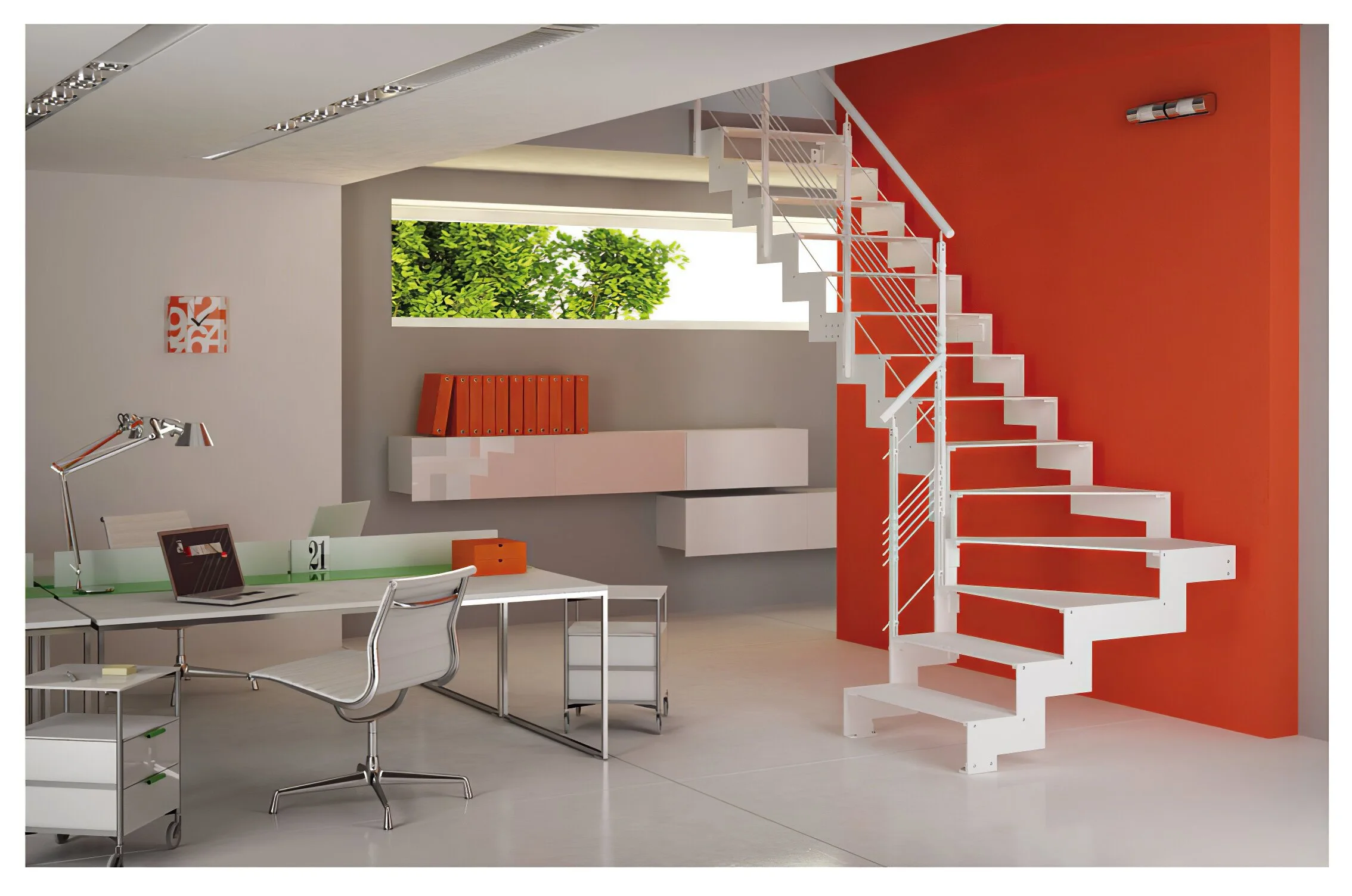 Escalera con estructura lateral en zigzag, en hierro pintado cortada al láser.
